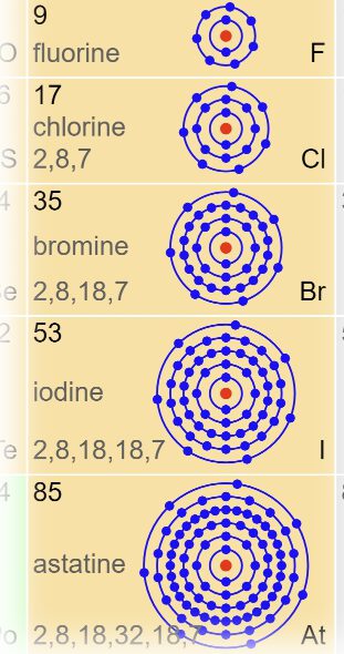 Die Halogene bilden durch Aufnahme eines fremden Elektrons einfach negativ geladene Ionen, die „Halogenidionen“. Dazu gehören das Fluoridion \( (F^- ) \) , Chloridion \( ( Cl^-) \) , Iodidion \( (I^-) \) und das Bromidion \( (Br^-) \). Astat ähnelt in seinem chemischen Verhalten dem Element Iod.