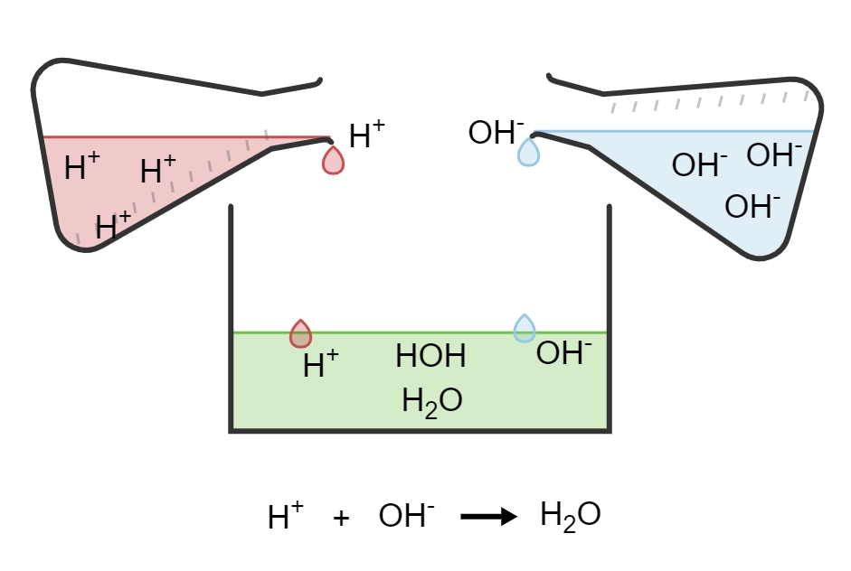 Hier wird Natronlauge (NaOH) in Wasser gegeben. Dazu kommt dann Salzsäure(HCl). Die Ionen verteilen sich im Wasser und beginnen sich umzulagern. Es entsteht aus den Ionen der Base \( (OH^-) \)und den Ionen der Säure\( (H^+) \)… nur Wasser.